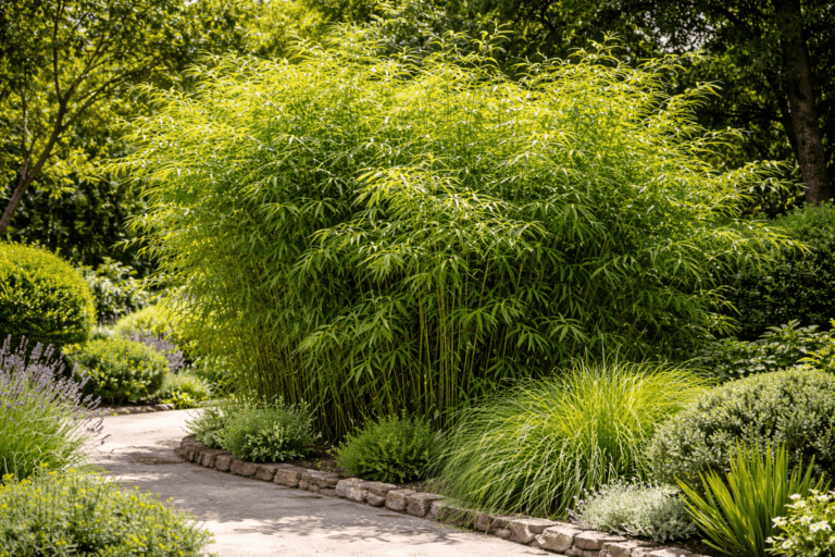 Aporta movimiento, ligereza y un fondo verde muy homogéneo. Las variedades no invasivas, como el Fargesia, son las más recomendables para jardines privados porque crecen sin extenderse de forma descontrolada.