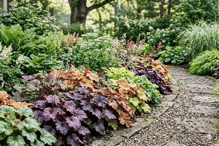 La heuchera es otra vivaz de semisombra con mucho interés decorativo. Sus hojas redondeadas en tonos que van del verde al burdeos, pasando por el naranja o el granate, dan color al borde durante toda la temporada sin necesidad de flor.
