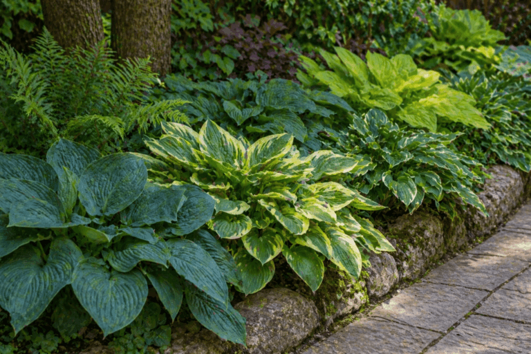 Si el camino discurre por una zona con sombra o semisombra, la hosta es una de las mejores opciones disponibles. Sus hojas anchas y de textura llamativa crean un borde con mucha presencia visual incluso sin flor.