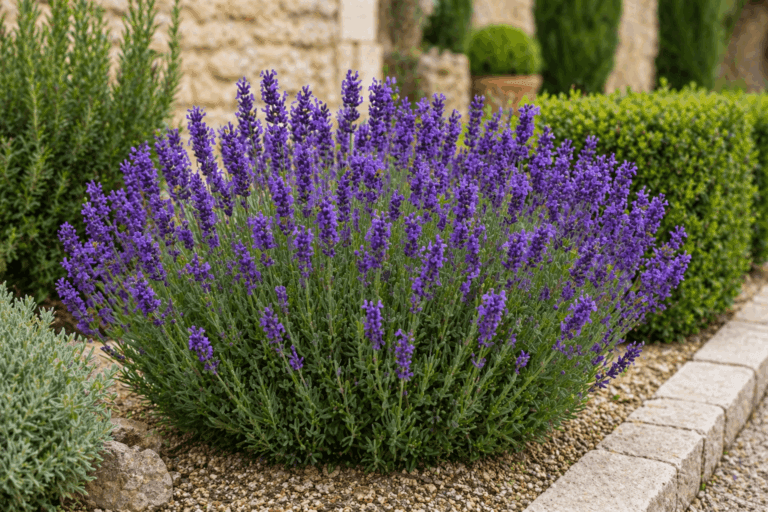 Las variedades compactas de lavanda (lavandula angustifolia ‘Hidcote’ o similares) alcanzan entre 30 y 40 centímetros de altura, lo que las hace muy manejables en bordes de camino. Aportan estructura, aroma y floración lila que dura varias semanas.