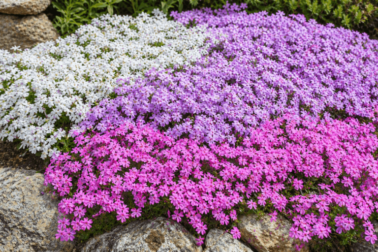 El Phlox rastrero florece con generosidad a finales de primavera, cubriendo el suelo de pequeñas flores en tonos rosa, blanco o lila. Fuera de la época de floración su follaje es discreto pero permanece verde durante todo el año, lo que lo hace útil como tapizante de bajo mantenimiento.