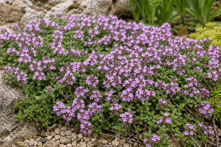 El tomillo rastrero es una de las plantas más útiles para bordes en zonas soleadas. Se extiende formando una alfombra densa y de poca altura, con pequeñas flores rosas o lilas en primavera. Es una opción que te dará un atractivo visual durante semanas.