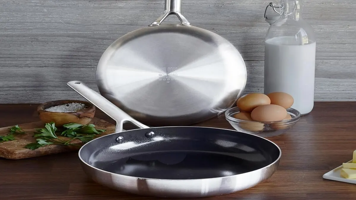 Lo que hace destacar a este kit de dos sartenes es su mezcla de materiales. Cuentan con un centro de aluminio, envuelto en dos placas de acero inoxidable y coronado con el revestimiento cerámico reforzado con diamantes. Es seguro, al ser libre de PFAS.