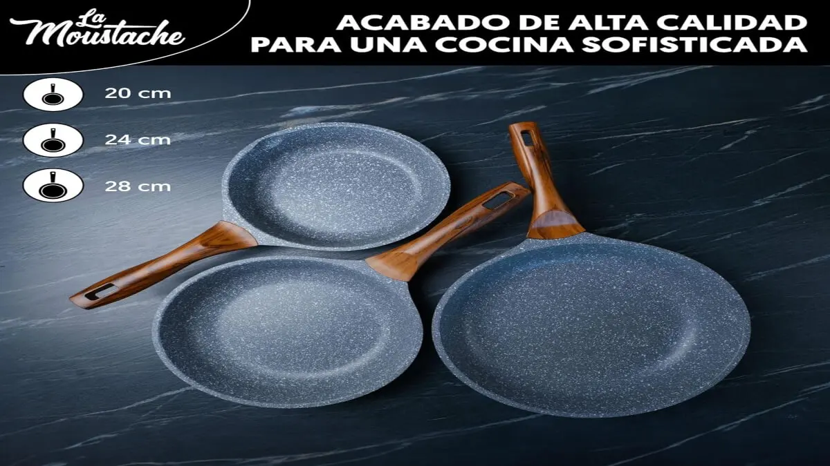 Si buscas un juego de sartenes con un diseño diferente, pero que te garantice una buena antiadherencia sin curado, estos son los que debes elegir. El kit incluye tres sartenes de 20, 24 y 28 cm cada uno.