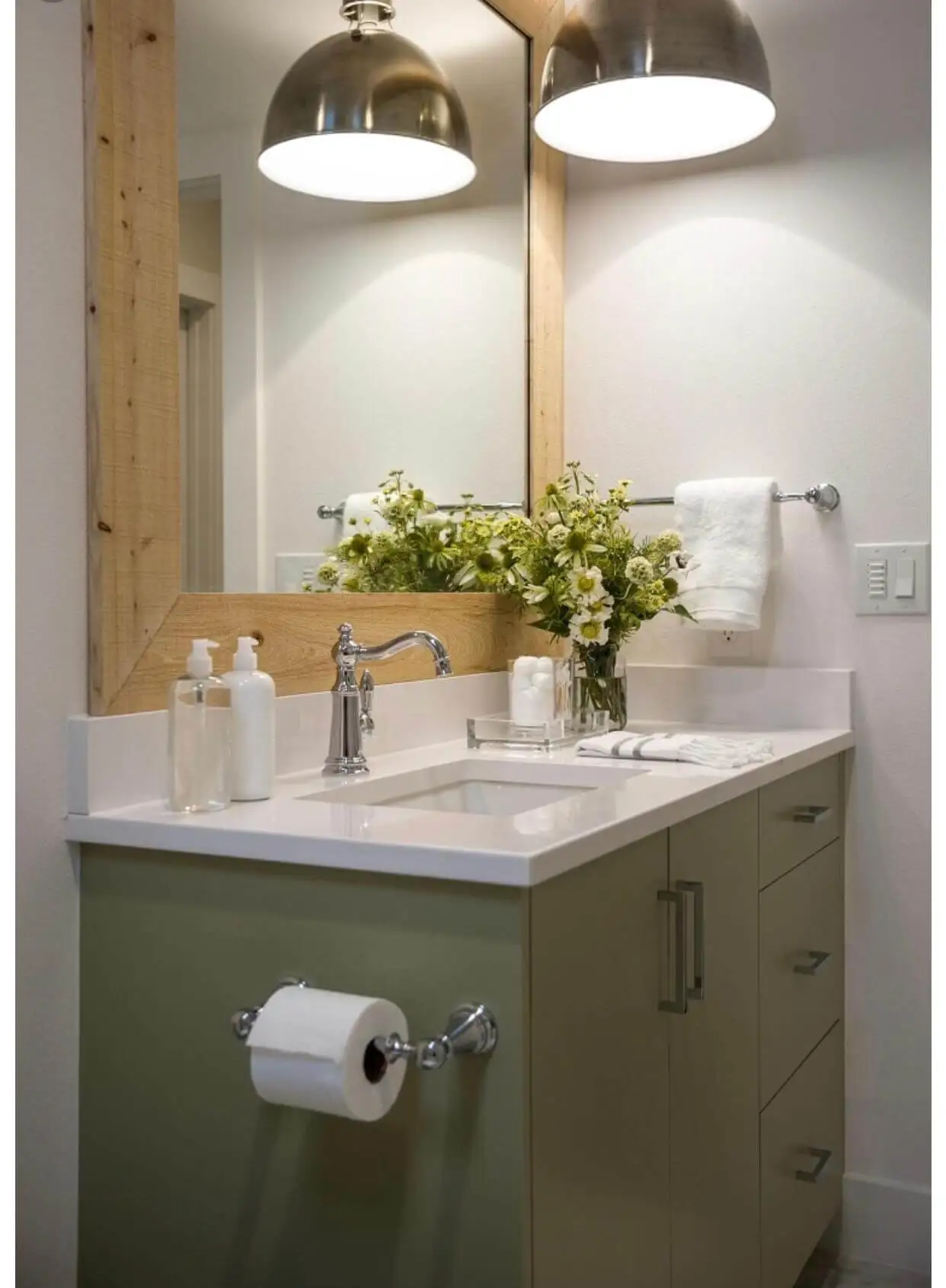 Si combinas los arreglos florales con unos colores suaves y vivos puedes generar un estilo más armonioso a tu baño. Una buena idea para resaltar los azulejos es añadir unas buenas lámparas.