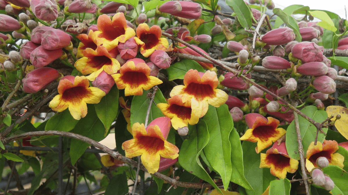 Esta bella enredadera produce flores tubulares en tonos naranja y amarillo que contrastan con su follaje verde brillante. Su capacidad de adaptación es notable, ya que puede desarrollarse bien tanto en pleno sol como en semisombra.