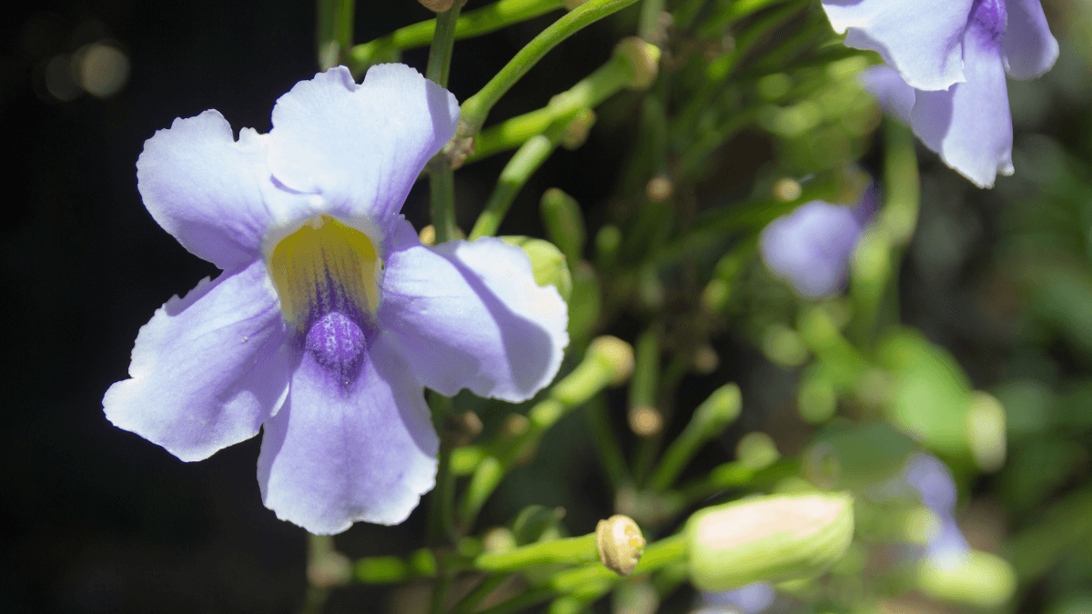 De crecimiento rápido y follaje denso, esta planta produce flores grandes de color azul lavanda con un centro amarillo, aportando un toque exótico al jardín. Es ideal para cubrir enrejados y vallas. Prefiere pleno sol, aunque tolera algo de sombra ligera.
