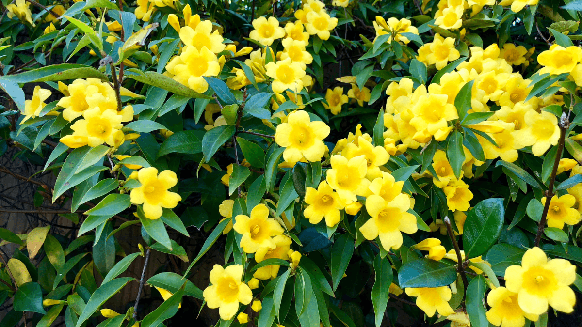 Con una floración espectacular en primavera, el jazmín amarillo cubre pérgolas y muros con cascadas de flores doradas. Es una enredadera de crecimiento rápido que se adapta bien tanto a pleno sol como a semisombra. Su riego debe ser moderado, aumentando la frecuencia en verano para mantener su vigor. Es resistente a heladas suaves de hasta -5°C y se adapta bien a climas templados. Requiere podas ocasionales para controlar su crecimiento y estimular la floración.