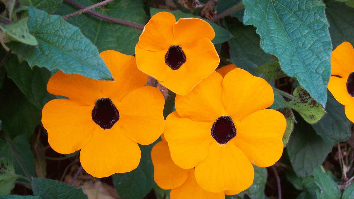 Esta enredadera de crecimiento acelerado destaca por sus flores en tonos naranjas o amarillos con un distintivo centro oscuro. Es perfecta para arcos, donde trepa con facilidad gracias a sus tallos flexibles. Prefiere pleno sol o semisombra y suelos ligeros y bien drenados.