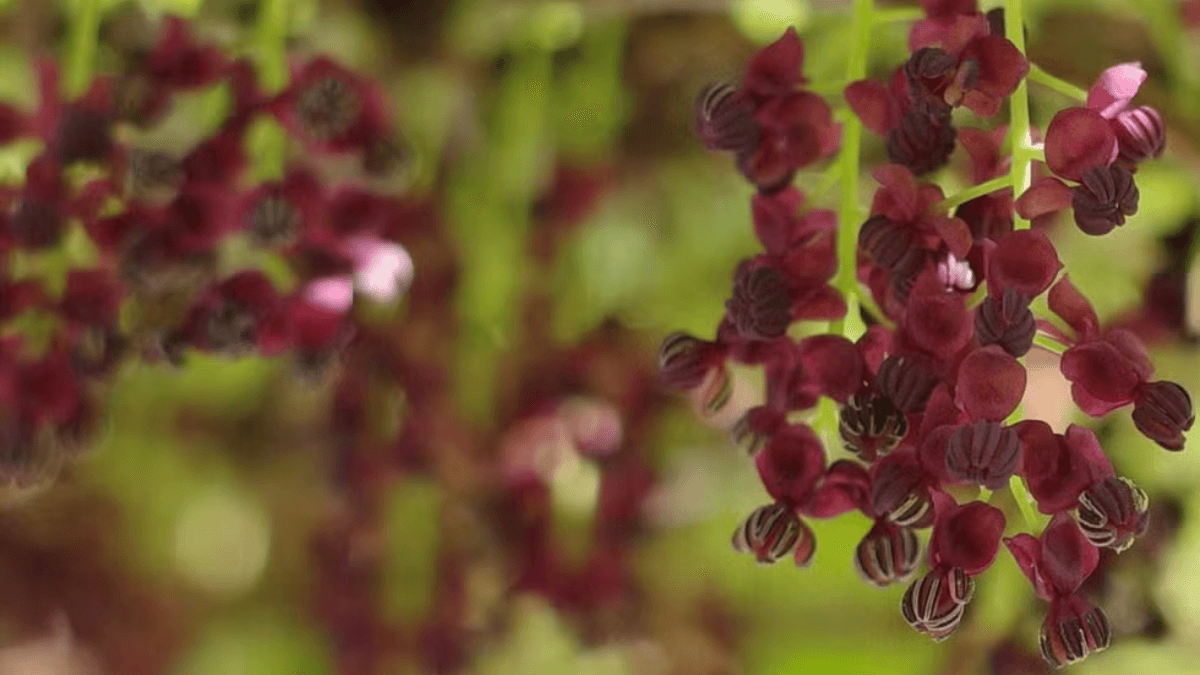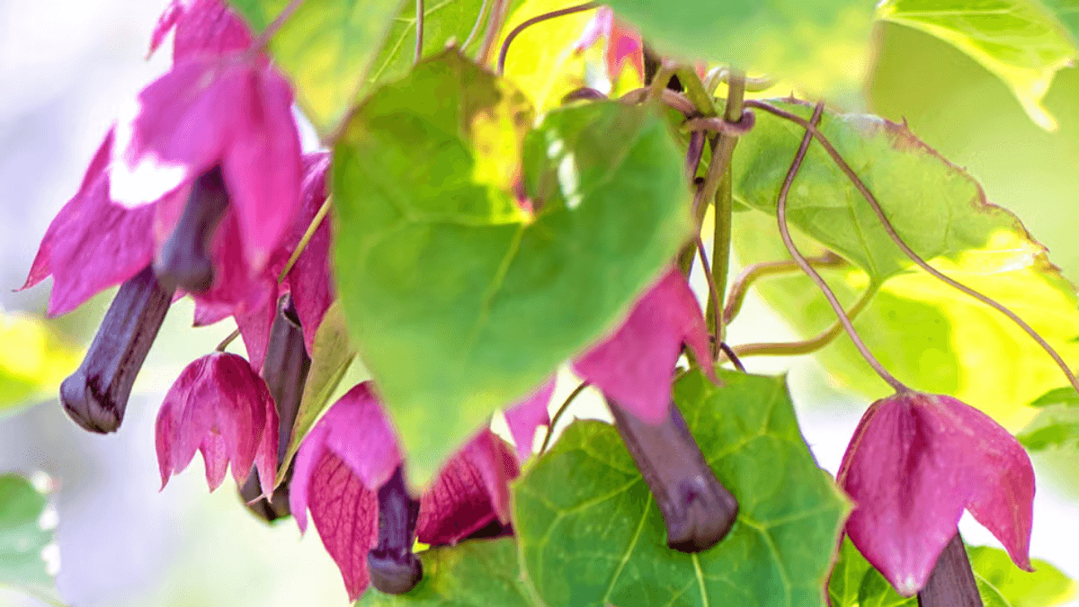 Esta enredadera delicada es apreciada por sus flores colgantes en tonos morados oscuros, que contrastan con su follaje verde vibrante. Es perfecta para enrejados pequeños, donde su crecimiento moderado puede ser manejado fácilmente.