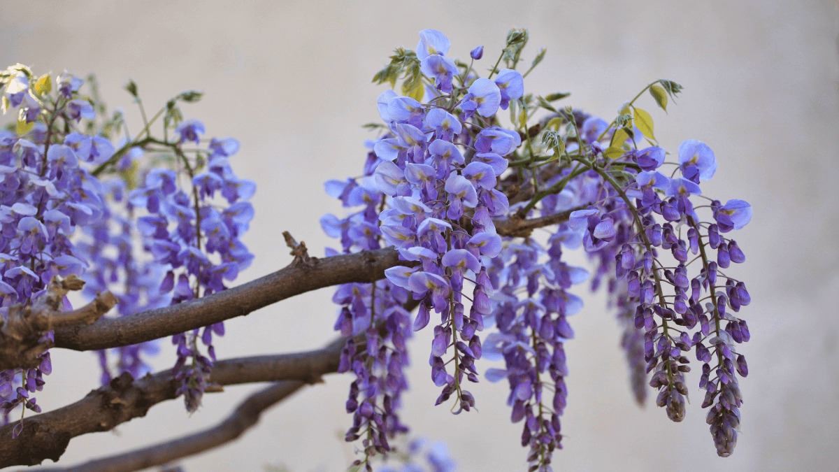 Esta es una de las enredaderas más espectaculares del mundo, famosa por sus racimos colgantes de flores en tonos lilas, azulados y blancos. Originaria de China y Japón, la glicina puede alcanzar hasta 20 metros de largo si se le permite extenderse libremente. Su crecimiento inicial es lento, pero una vez establecida se convierte en una de las trepadoras más vigorosas.