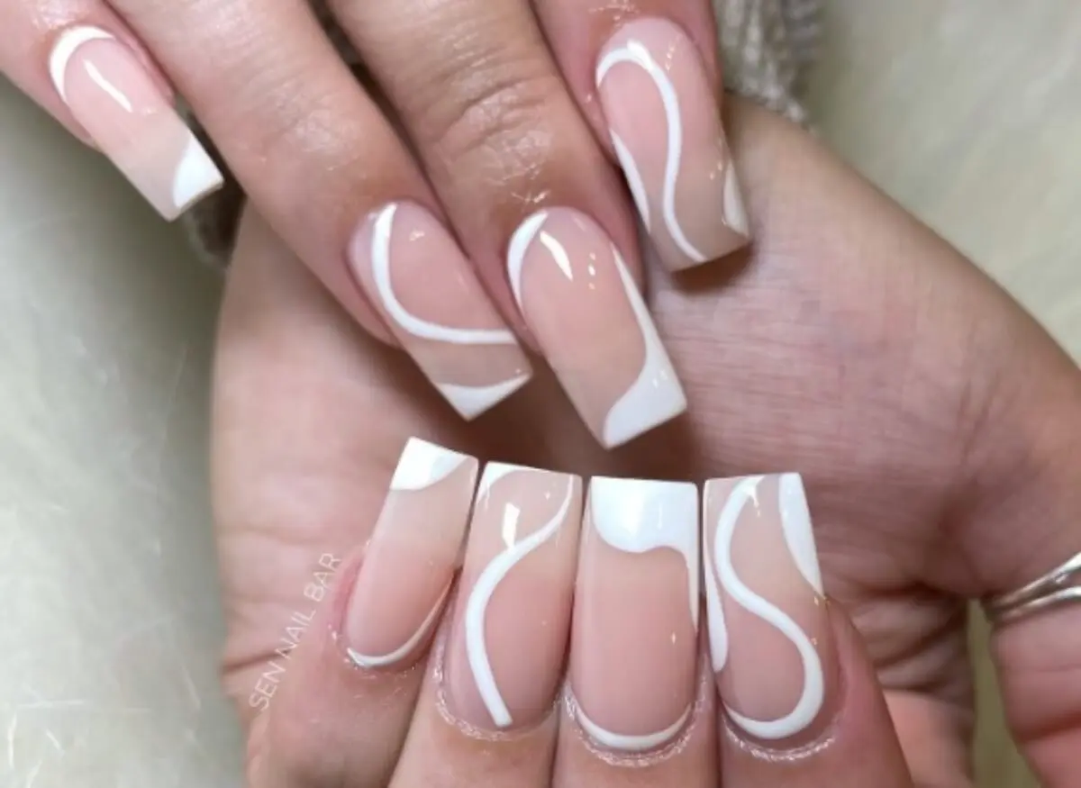 Para las amantes de la simplicidad y la elegancia, las uñas largas con diseño swir en tonos nude y curvas blancas, son la elección perfecta. Este estilo sutil agrega un toque de sofisticación a tu manicura, manteniendo una paleta de colores neutros.