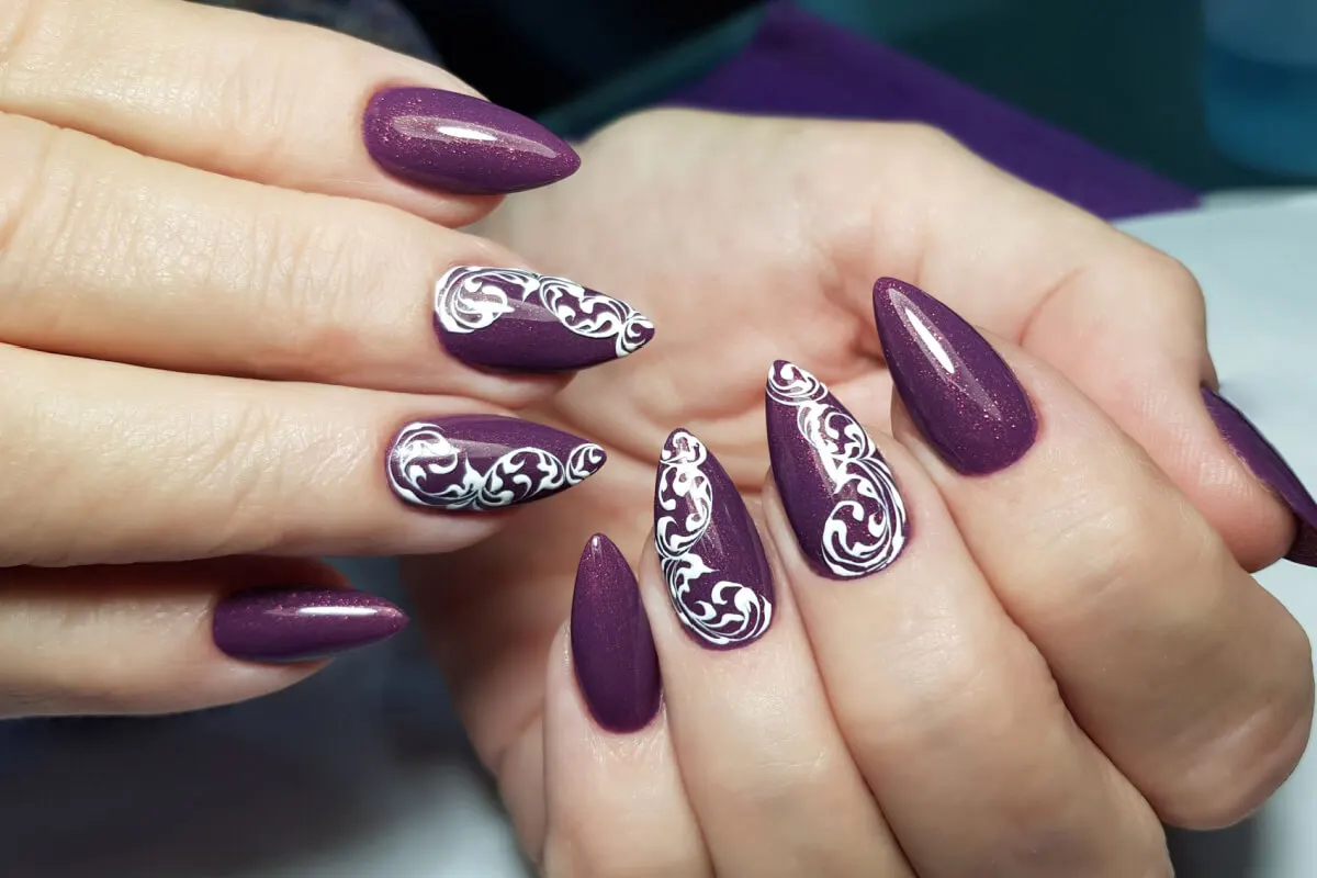 Las uñas almendradas se distinguen por su elegancia, y cuando se combinan con el color violeta y el diseño swir, el resultado es simplemente magnífico. Con este tono y forma se crea una apariencia delicada que son complementadas con las curvas suaves, generando un equilibrio armonioso.