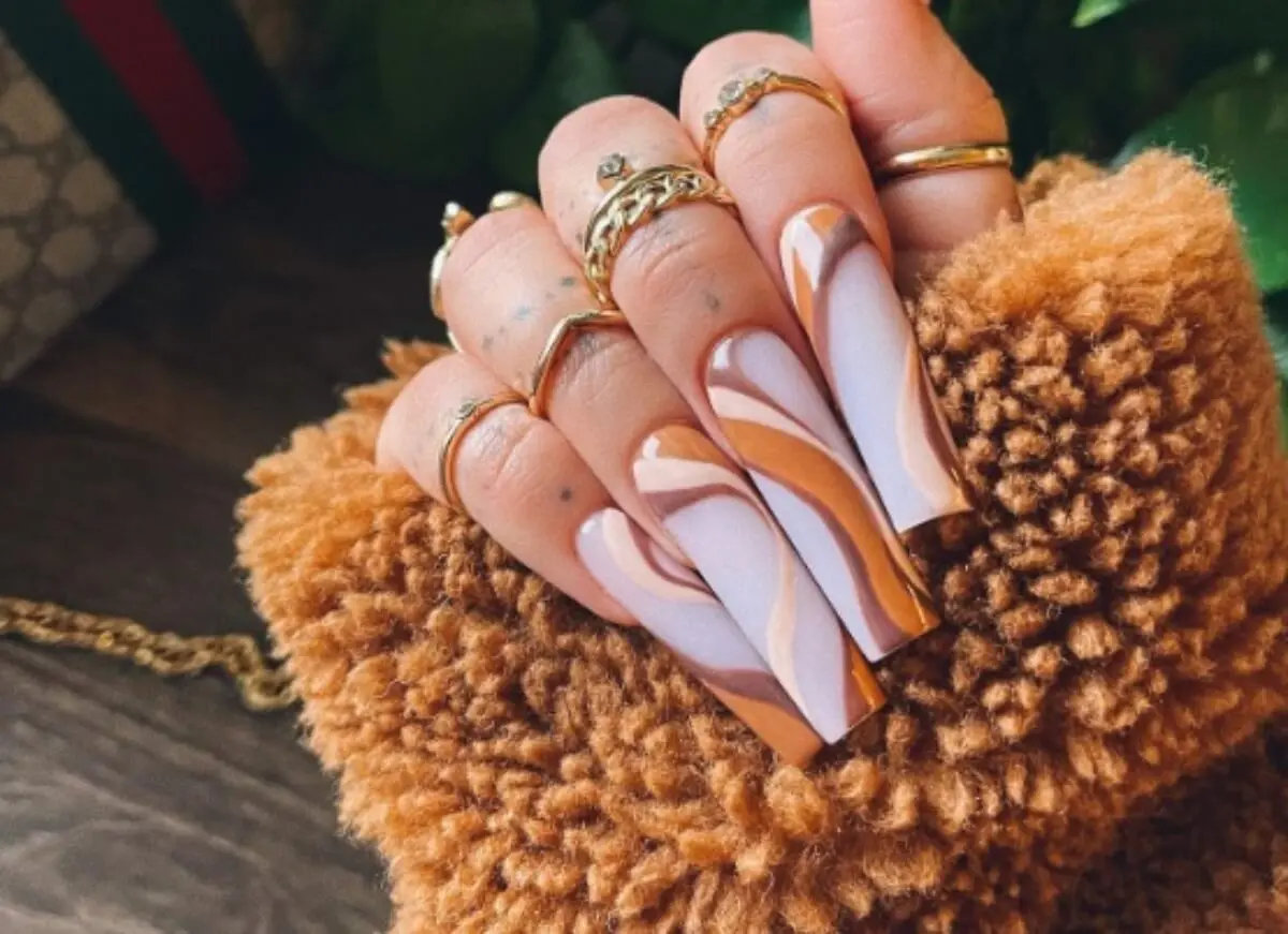A medida que nos adentramos en la temporada de otoño, los diseños en tonos chai latte se convierten en protagonistas. En estas uñas swir, los matices de marrones se mezclan en curvas fascinantes, generando un aspecto que refleja la belleza de la naturaleza en esta época del año.