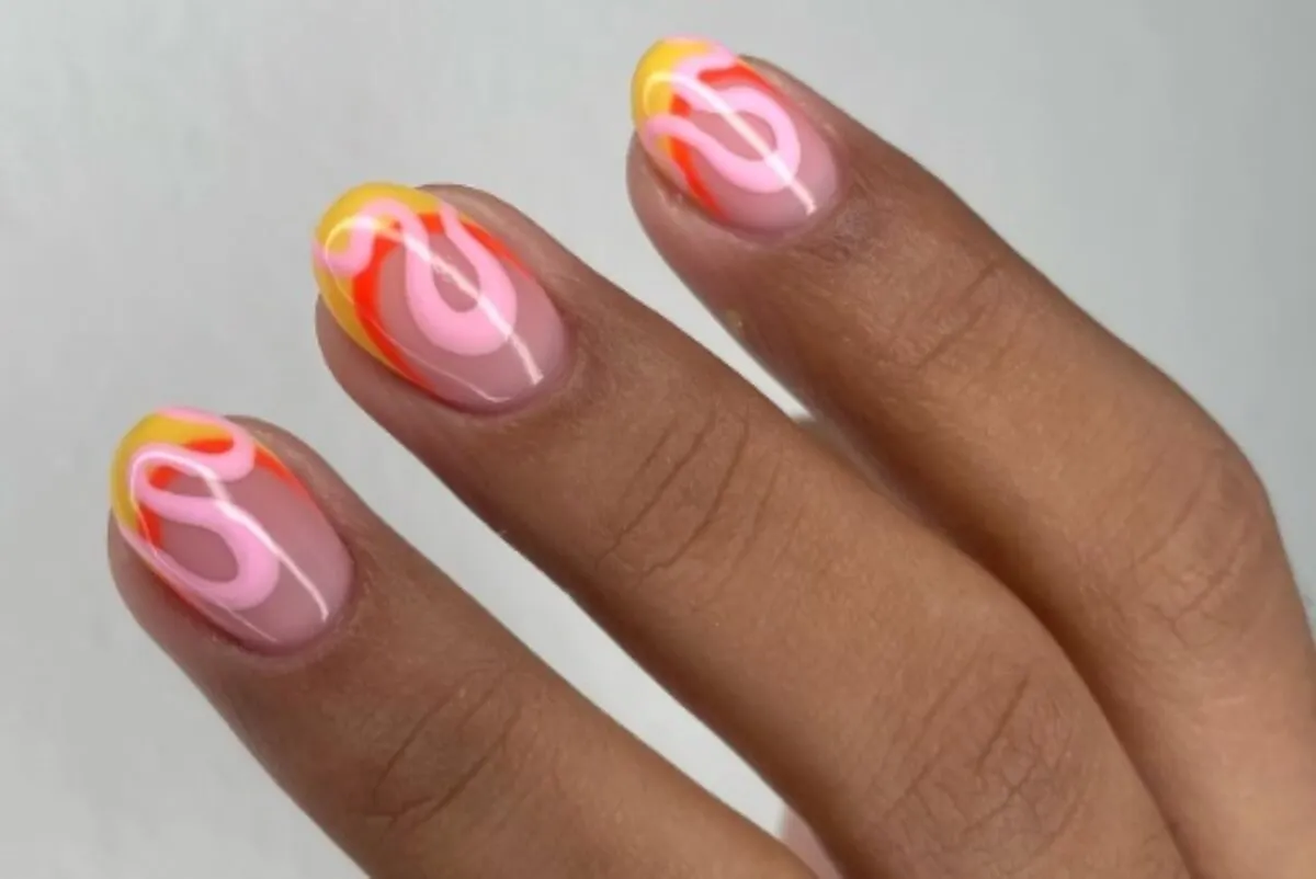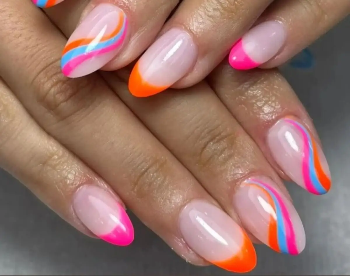 Una de las formas de hacer el estilo swirl nails, ideal para las almas audaces y amantes de la energía vibrante, es con colores neón. Los tonos llamativos como fucsia, celeste, anaranjado, amarillo crean un diseño swir que no pasa desapercibido.