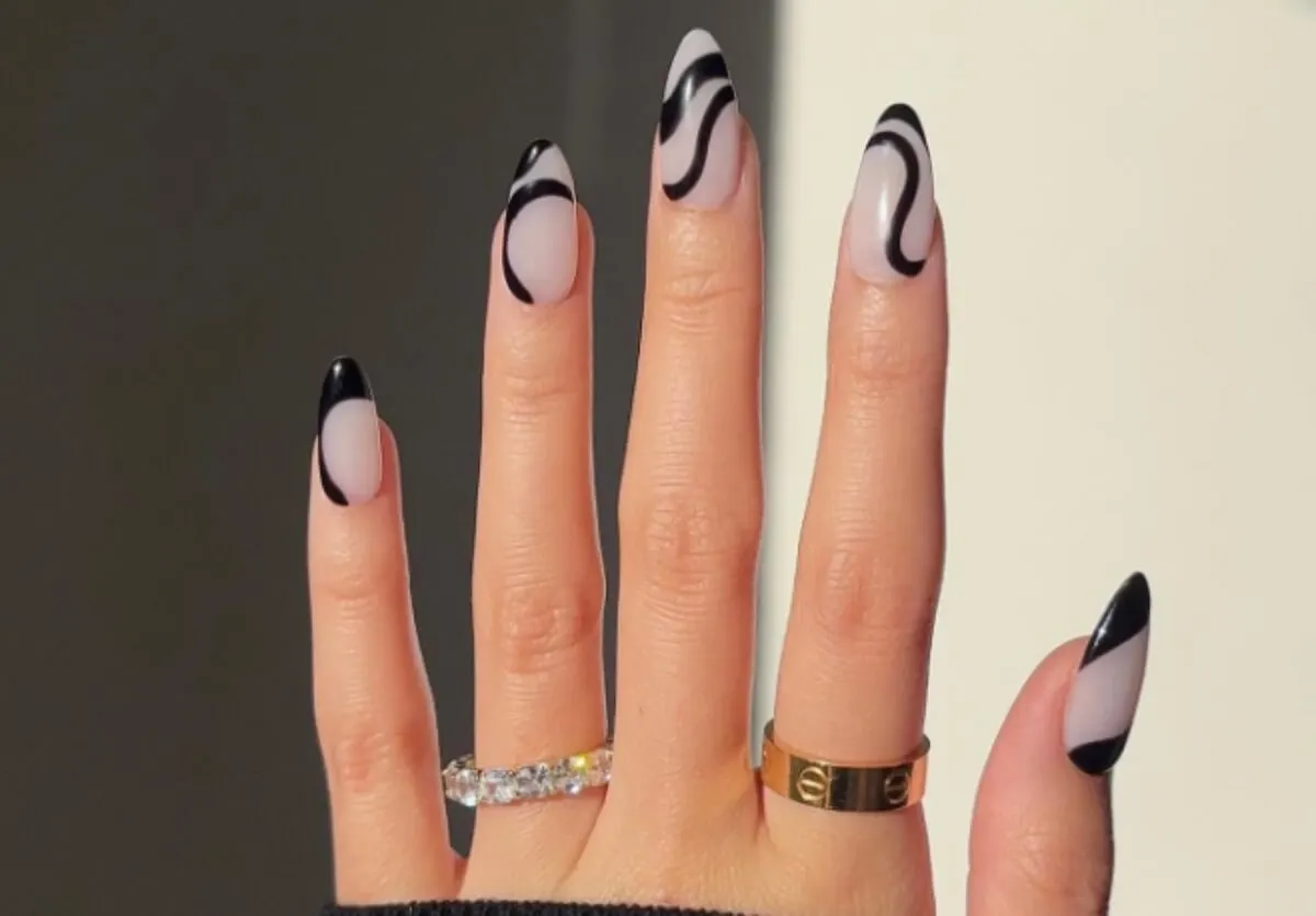 Las swir nails en tonos clásicos como blanco y negro aportan sofisticación, especialmente a looks otoñales y de invierno. Esta combinación es perfecta para las que buscan lucir más discretas, pero igual de elegantes. Las curvas en negro sobre una base piel producen un contraste sutil y atractivo, añadiendo un toque de misterio a tus uñas.