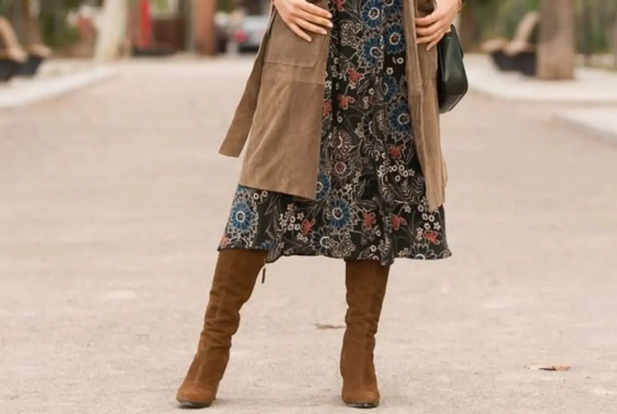 Para un estilo bohemio y campestre, elige vestidos largos con estampados florales en tonos invernales. Opta por botas altas en tonos neutros para equilibrar el diseño. Este look es perfecto para eventos casuales o salidas durante el día.