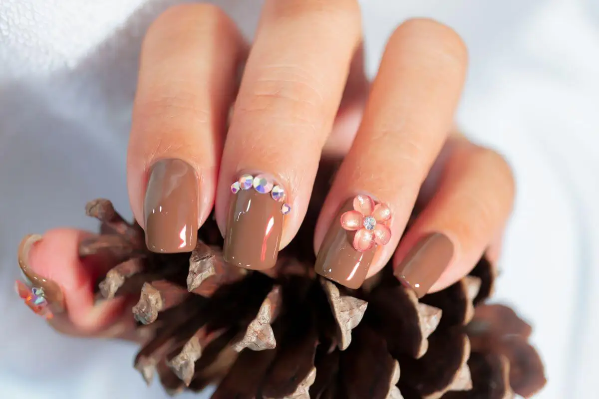 Si eres un poco más atrevida con tus manicuras, esta propuesta con aplicaciones en 3D te gustará. Elige un tono de la gama de colores del chai latte para pintar todas las uñas; si lo prefieres, puedes combinar varios tonos. Para terminar, aplica el diseño de la referencia con piedras adhesivas.