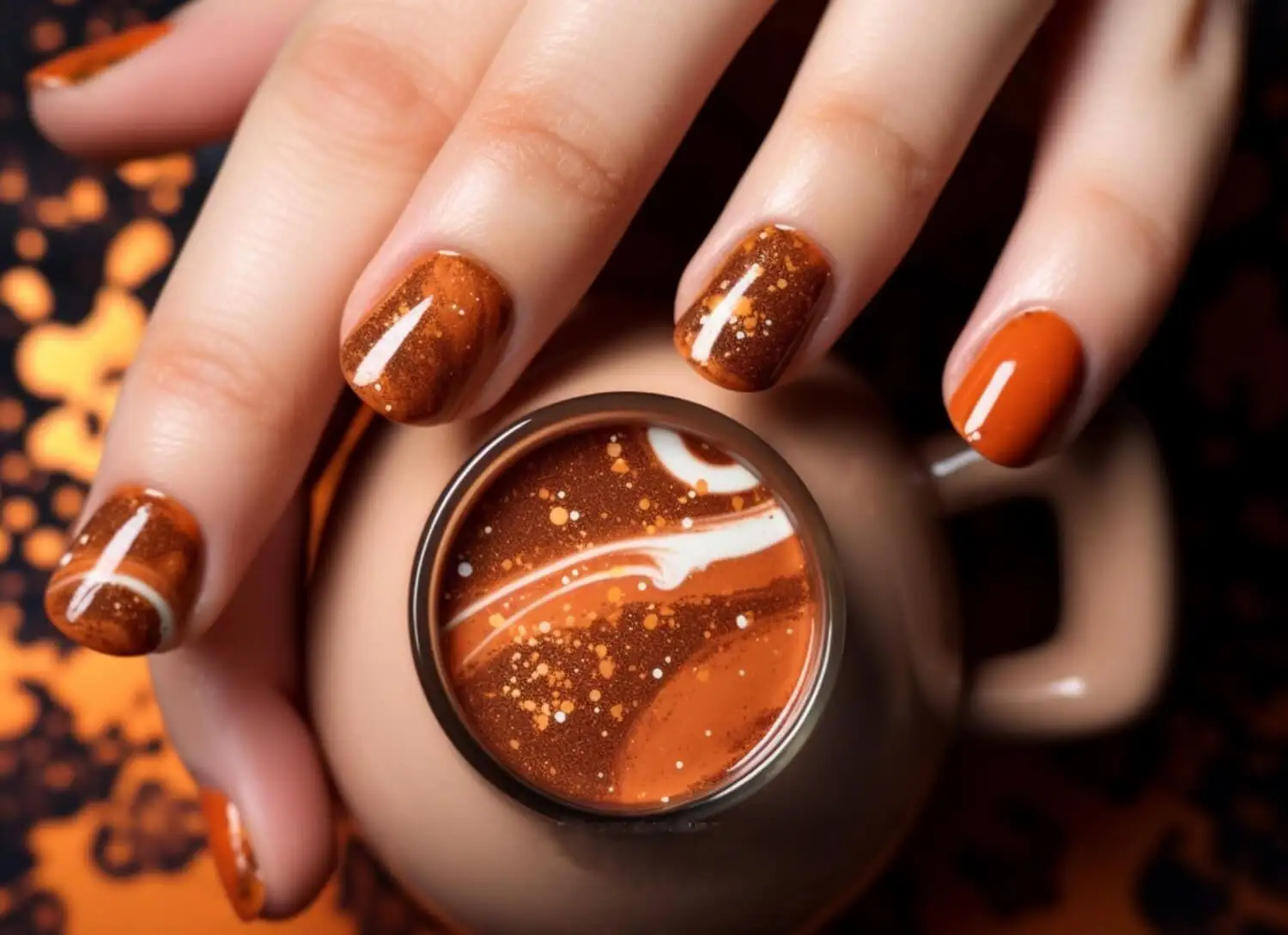 Llegamos a uno de los diseños de uñas chai latte más llamativos. En este caso, hay que jugar con toda la gama de colores de la bebida ancestral para obtener un acabado galáctico como el que muestra la imagen de referencia. Finaliza con una capa de brillo para resaltar.