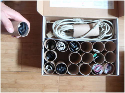 Seguro que tienes un montón de aparatos domésticos. En ocasiones, tantos cables sueltos pueden molestar al caminar o limpiar. Pero, ¿por qué no usar un simple rollo de cartón para tenerlos bien protegidos? El más recomendado sería el rollo de papel de cocina, puesto que es más largo. Puede decorarse con cintas o papeles de color atractivo utilizando pegamento de papel o cinta adhesiva transparente para que no se suelten. ¡Muy fácil!