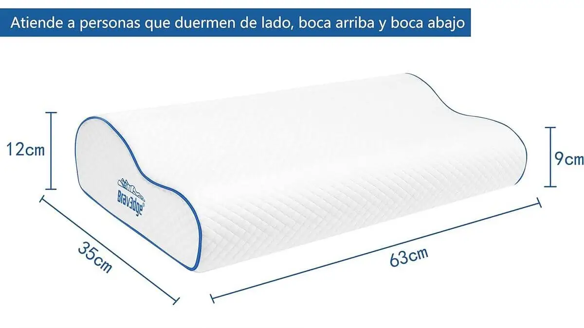 Tiene forma de ola y está hecha en espuma viscoelástica, para que así recupere su forma luego de una noche de uso. En cuanto a sus dimensiones, estas son de 55 cenímetros de largo, 35 centímetros de ancho, así como 11 y nueve centímetros en altura.
