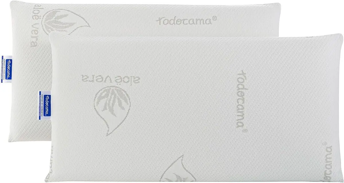 Este par de almohadas Todocama están hechas de espuma viscoelástica, que mantiene su forma por gran tiempo. Tienen una altura de 13 centímetros, un largo de 70 centímetros y un ancho de 36 centímetros. Esto, sumado a su dureza media/alta, las hace muy buenas opciones para dormir boca arriba y de lado.