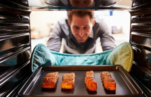 - Cubrir una fuente de horno con papel de hornear y colocar dos de las mitades en el fondo.