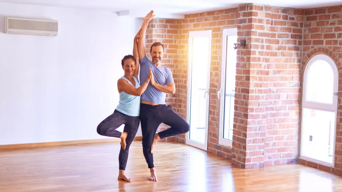 El yoga es una actividad beneficiosa para el cuerpo y la mente que, practicada en pareja, sirve para fortalecer la relación. Existen numerosas posturas que se ejecutan en comunión con el cuerpo del otro, como el árbol (vrksasana).