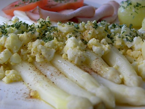 - Pon los espárragos en una fuente, espolvorea los huevos picados y vierte la salsa.