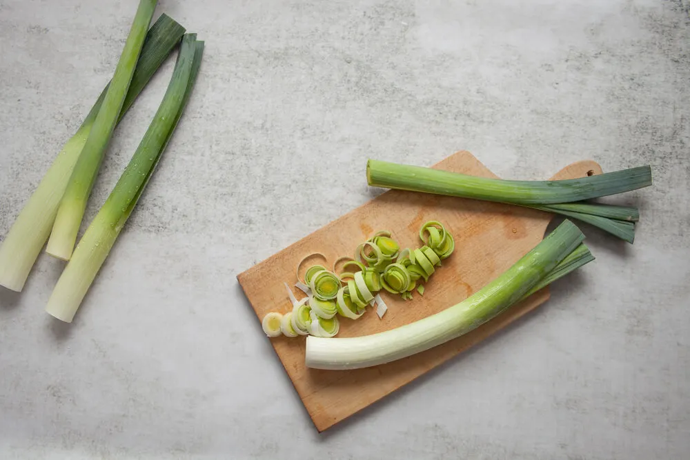 - Para empezar lavar, pelar y picar la cebolla. Lavar y cortar el puerro en rodajas finas y las patatas en cubos. Las hojas verdes de los puerros se pueden reservar para usarlas en otros platos.