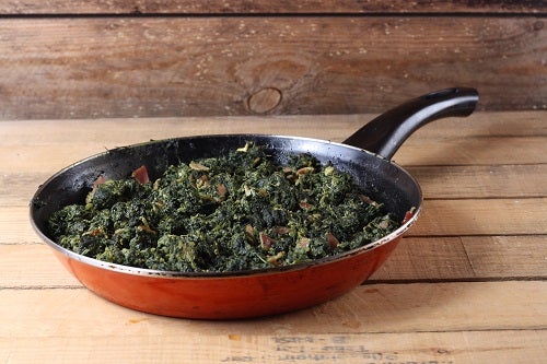 Coloca las espinacas a hervir y cuando estén listas vierte la crema. Bate en un tazón grande los huevos y añade las espinacas con la crema cuando se enfríen. En una sartén derrite la mantequilla, a fuego lento. Vierte la mezcla y deja que se cocine durante ocho minutos (hasta que cuaje). Retira del fuego y coloca el queso rallado. Vierte en una placa para horno y haz que el queso se derrita bien.