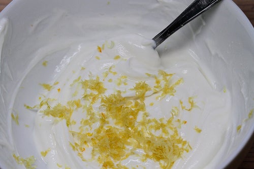 - Mezcla el yogur natural enterno con jugo de un limón y ralladura de limón