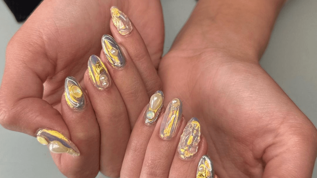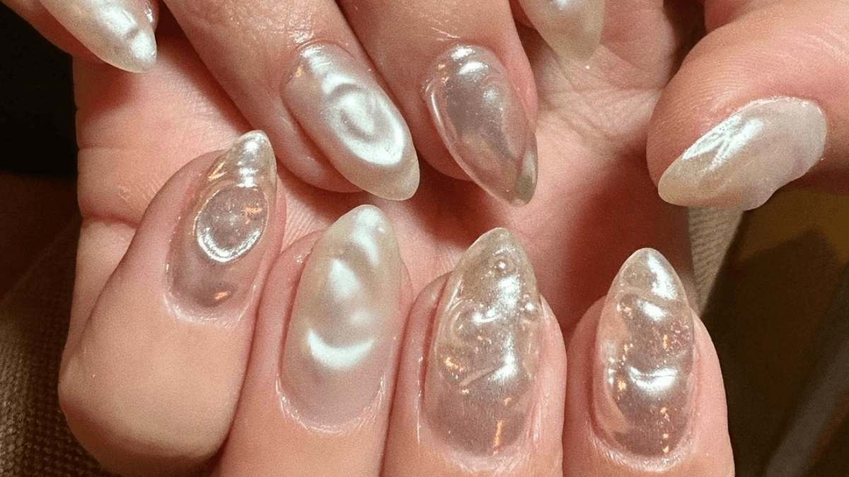 Esta manicura iridiscente, creada por Kim Truong, que imita el brillo de las conchas marinas, se ha vuelto viral en las redes sociales. Consiste en esculpir un diseño tridimensional en cada uña, que imite las irregularidades de las perlas dentro de la concha.