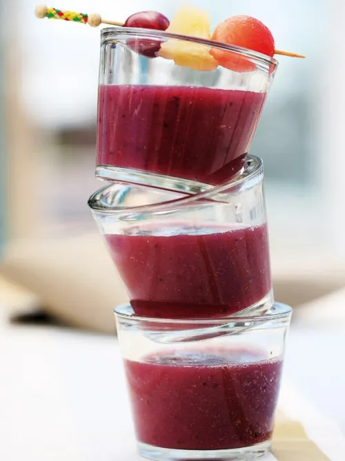 Vierte todos bien lavados, pelados y troceados (según corresponda) en el vaso de la licuadora, mezcla bien y sirve.